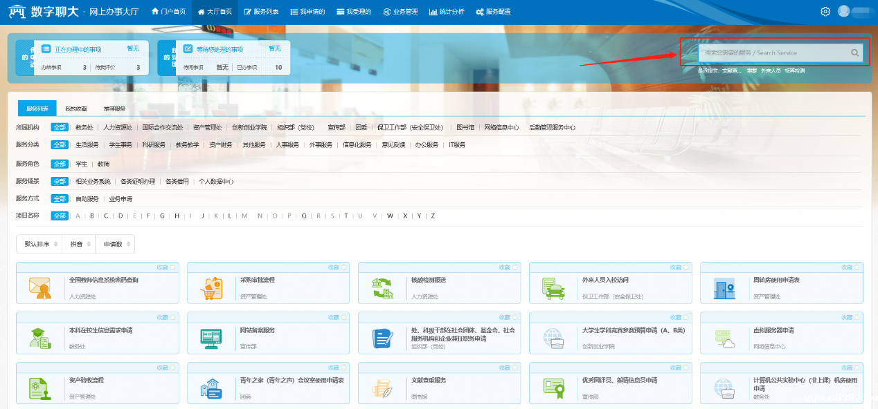 1.在此以【文献查重服务】举例,在办事大厅首页右上角搜索相关服务流程如下图: