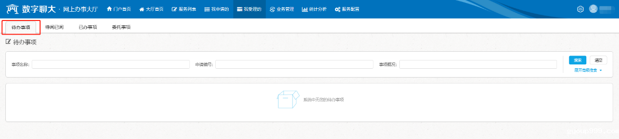 2.点击上方【我受理的】查看本人受理的业务流程,点击【待办事项】显示待本人办理的业务流程,点击【已办事项】显示本人已办理的业务流程。